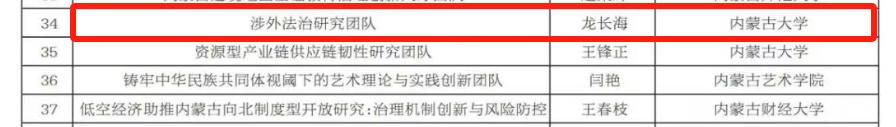近日,自治区党委人才工作领导小组办公室正式公示了《2025年“英才兴蒙”工程项目评审结果的公示》,由我院龙长海教授主持的涉外法治研究团队凭借扎实的科研基础、鲜明的研究特色及服务区域发展的突出潜力,成功入选2025年“英才兴蒙”工程本土培养人才团队项目名单。这一成果不仅是团队科研实力的重要体现,更是我院在高层次人才团队培育与学科建设领域的重大突破,为学院服务内蒙古自治区“五大任务”和重点产业发展注入新动能。