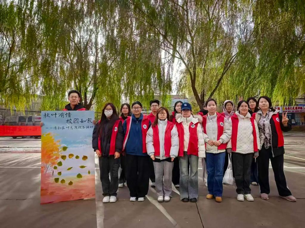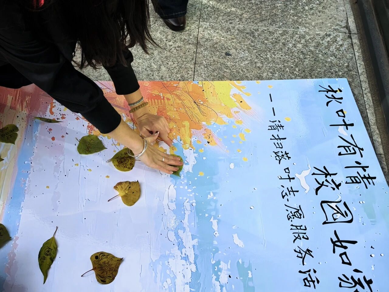 活动现场,同学们分工协作,手持清扫工具仔细清理园区内的落叶。同时,大家还用心收集形态各异的落叶,在叶片上写下对校园生活的寄语与青春感悟,将这些“专属记忆叶”张贴在展板上,留下独属于这个秋天的校园温情。