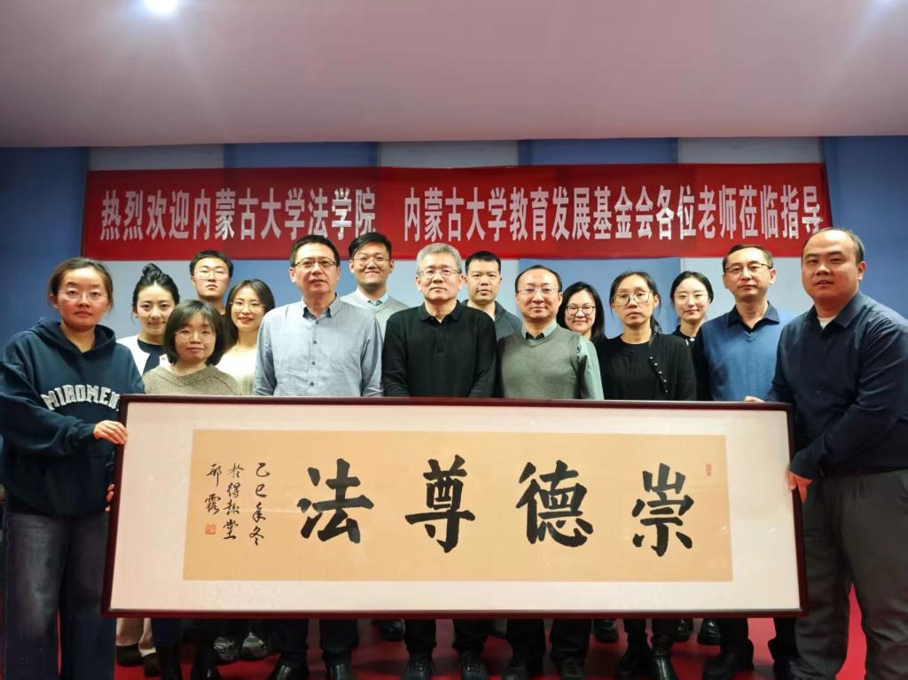 活动尾声,法学院向北京市法大(呼和浩特)律师事务所赠送题有“崇德尊法” 的书法作品。这四字不仅彰显了双方共同秉持的法治精神与价值追求,更见证了彼此携手共进、助力法治人才培养的友好合作关系。