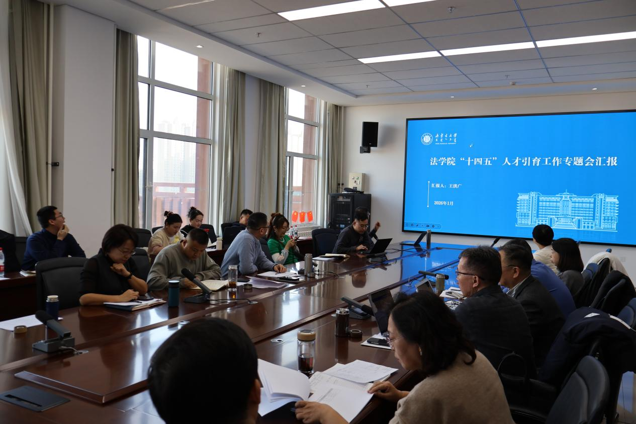2026年1月15日,法学院召开“十四五”期间人才引育工作专题会暨全院教职工大会。学院领导班子成员、党委委员、教授委员会委员和全体教职工参加会议。会议由法学院院长丁鹏教授主持。