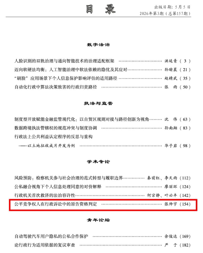 我院教师张帅宇在《行政法学研究》发表学术论文《公平竞争权人在行政诉讼中的原告资格判定》。