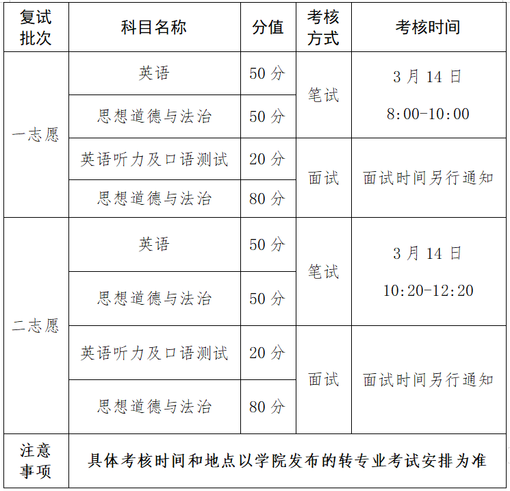 四、转专业考核方式和科目