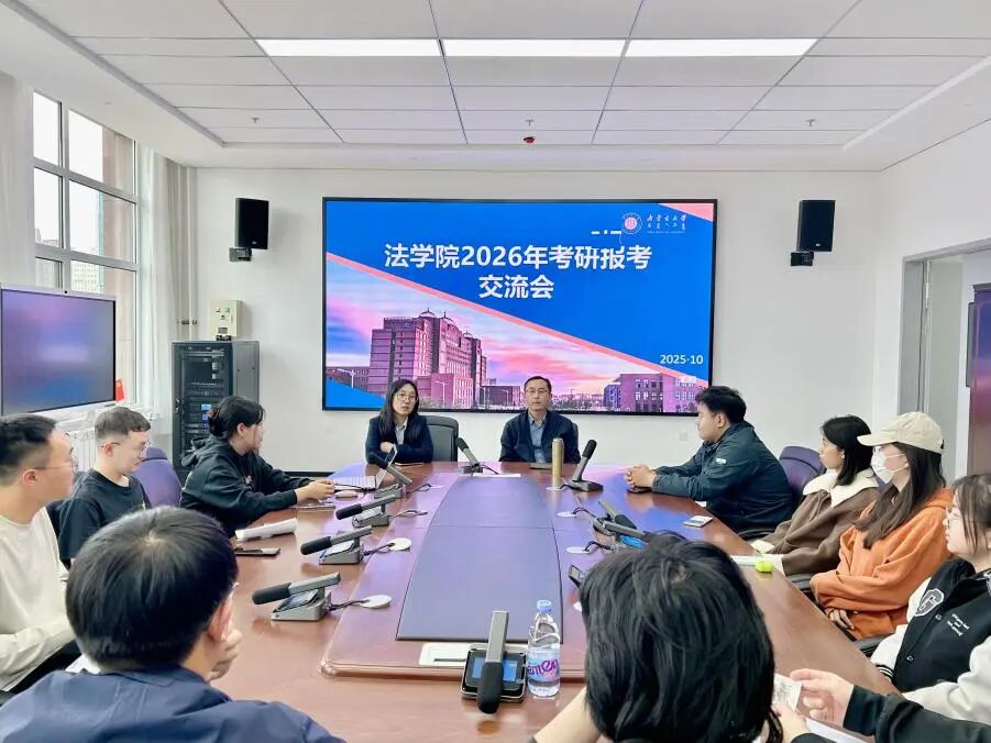 为切实解决我院本科生在考研报考规划、备考策略等方面的困惑,助力学子高效备战2026年硕士研究生考试,10月9日下午,我院在纪检监察大楼613会议室成功举办2026年考研报考交流会。法学院党委副书记宋学莹、副院长马波、辅导员蒋雪松出席会议,两位优秀考研学子担任分享嘉宾。