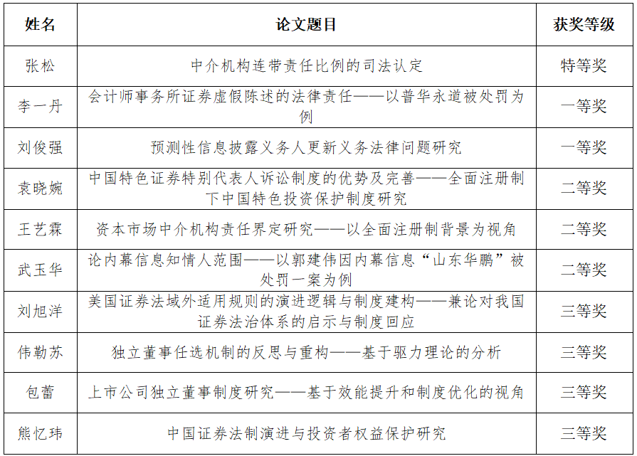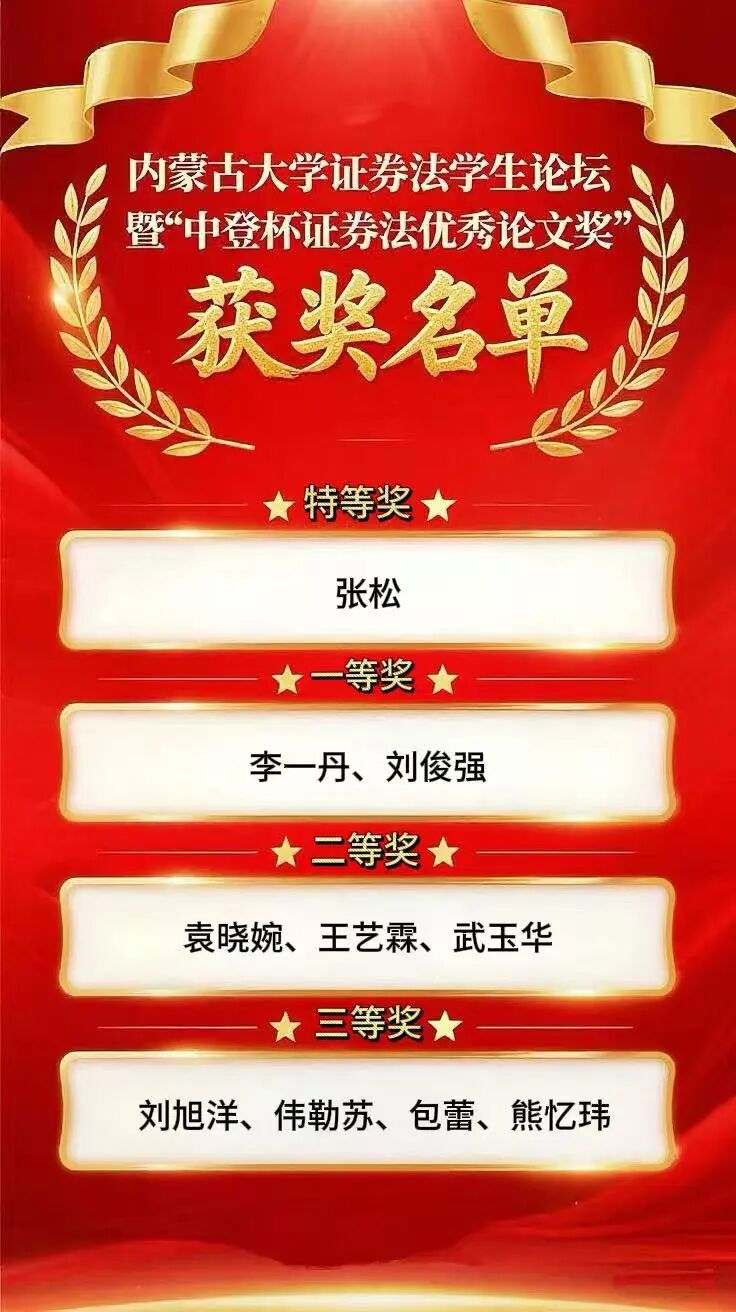 近日,由内蒙古大学法学院与中登律师事务所携手举办的“‘中登杯’证券法优秀论文奖”比赛评选结果揭晓。现将比赛结果公布如下: